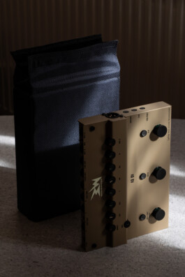 For the entire BASSWITCH product family, a shape was developed that allows easy adjustment of the control knobs during use, while preventing unintended changes during transport. Inspired by radios from the 1920s, the knobs are partially integrated into the overall shape, creating an elevation that also houses the device’s largest component. Formed from sheet steel and reinforced with folds, the switchers appear on stage with many international bands and artists.
